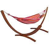 Für ein Hängemattenset (Hängematte mit Gestell) muss man tiefer in die Tasche greifen. Diese Tatsache ist jedoch mit der Flexibilität des Sets gerechtfertigt. Nicht jeder hat zwei Bäume so optimal im Garten stehen, dass eine Hängematte dazwischen festgemacht werden kann. Nicht jeder hat einen Garten! Der weitere Vorteil von Gestellen ist jener, dass sie auch nicht an Ort und Stelle verbleiben müssen. Sie können beispielsweise beim Rasenmähen einfach andernorts wieder aufgestellt werden. Ein Holzgestell ist sehr solide und qualitativ sehr hochwertig. Meist kommen Edelholz-Sorten zur Verwendung. Ein weiterer Punkt, der sich im Kostenfaktor niederschlägt. Auch die Tatsache, dass so ein Gestell (vor allem aus Aluminium) schnell abgebaut und in einem Campingbus verstaut ist, macht ein Hängemattenset so überaus attraktiv!